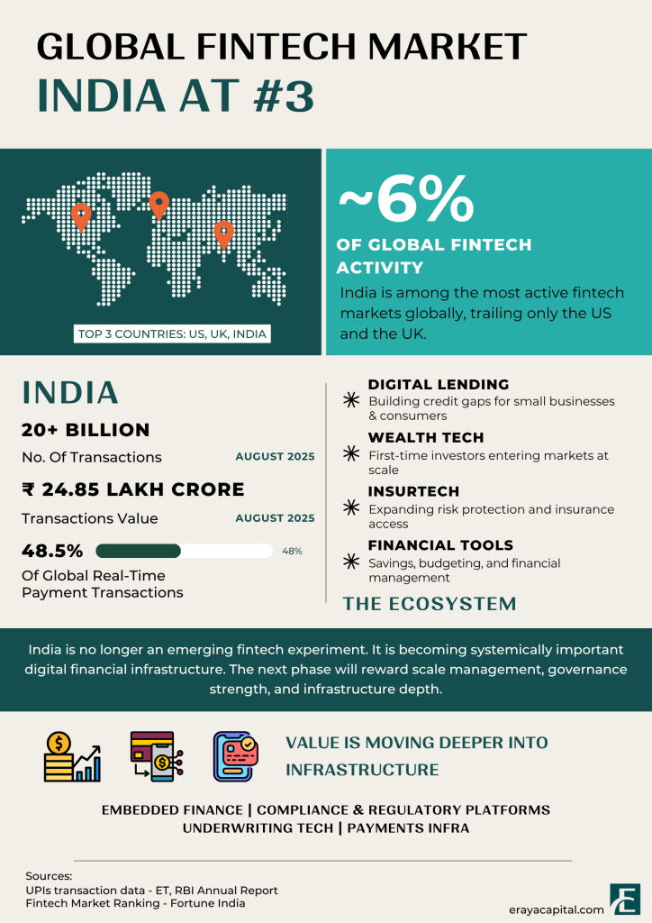 Recent data places India among the three most active fintech markets globally, behind only the United States and the United Kingdom. In 2025, Indian fintech firms secured over $4.3 billion across roughly 226 financings, representing nearly 6 percent of global fintech deal activity. That positioning is significant. It reflects an ecosystem that has moved beyond experimentation into global relevance.